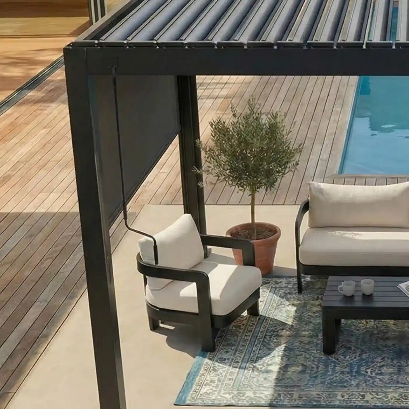The curtain provides additional shade, privacy, and protection from wind, making it ideal for both residential and hospitality environments.