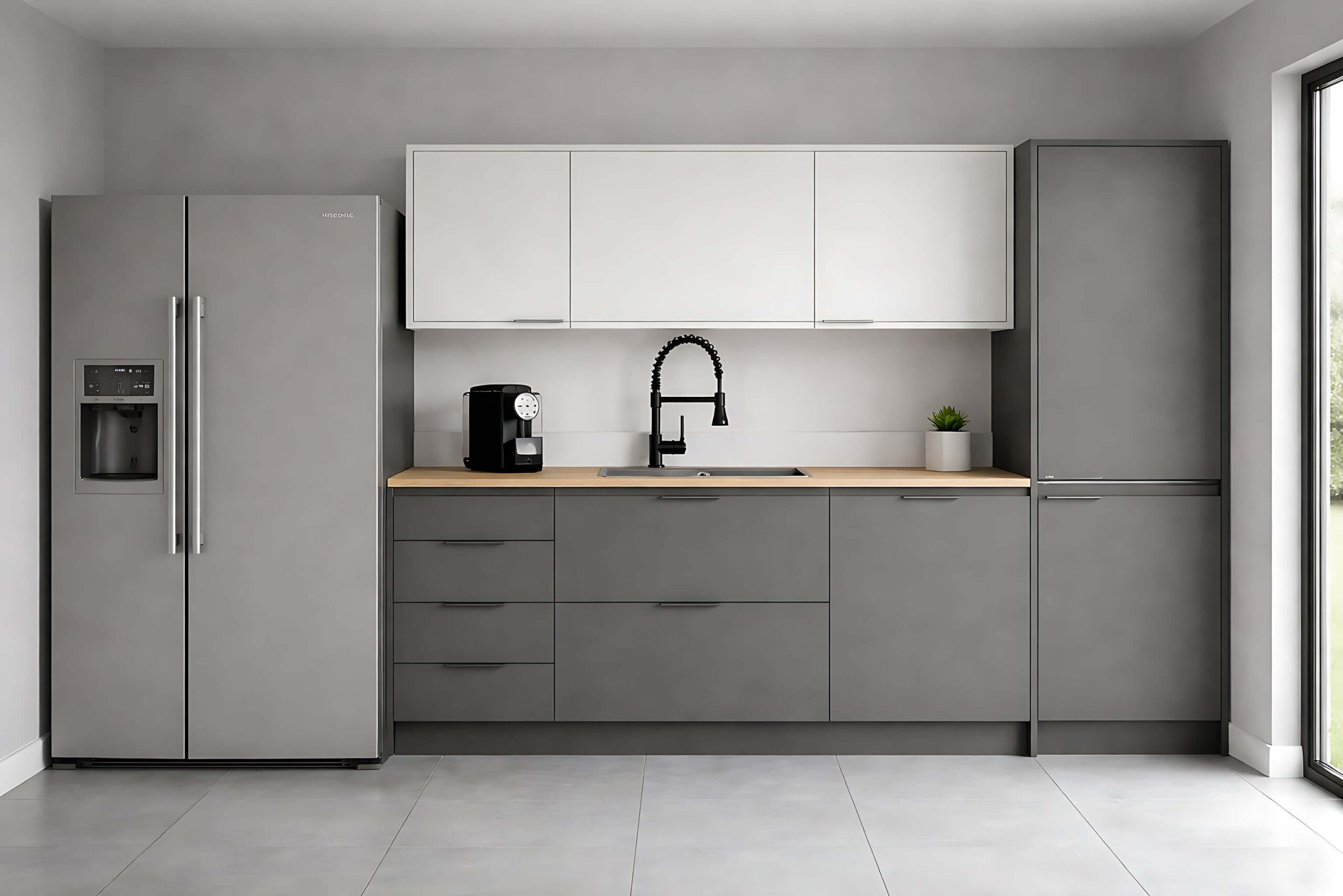 The André Compact Kitchen Unit is a modern modular kitchen solution designed for apartments, offices, rental units, and compact homes. Featuring a refined two-tone finish with matte charcoal base cabinets and clean white overhead units, this kitchen delivers a timeless contemporary look that blends style with everyday practicality.
