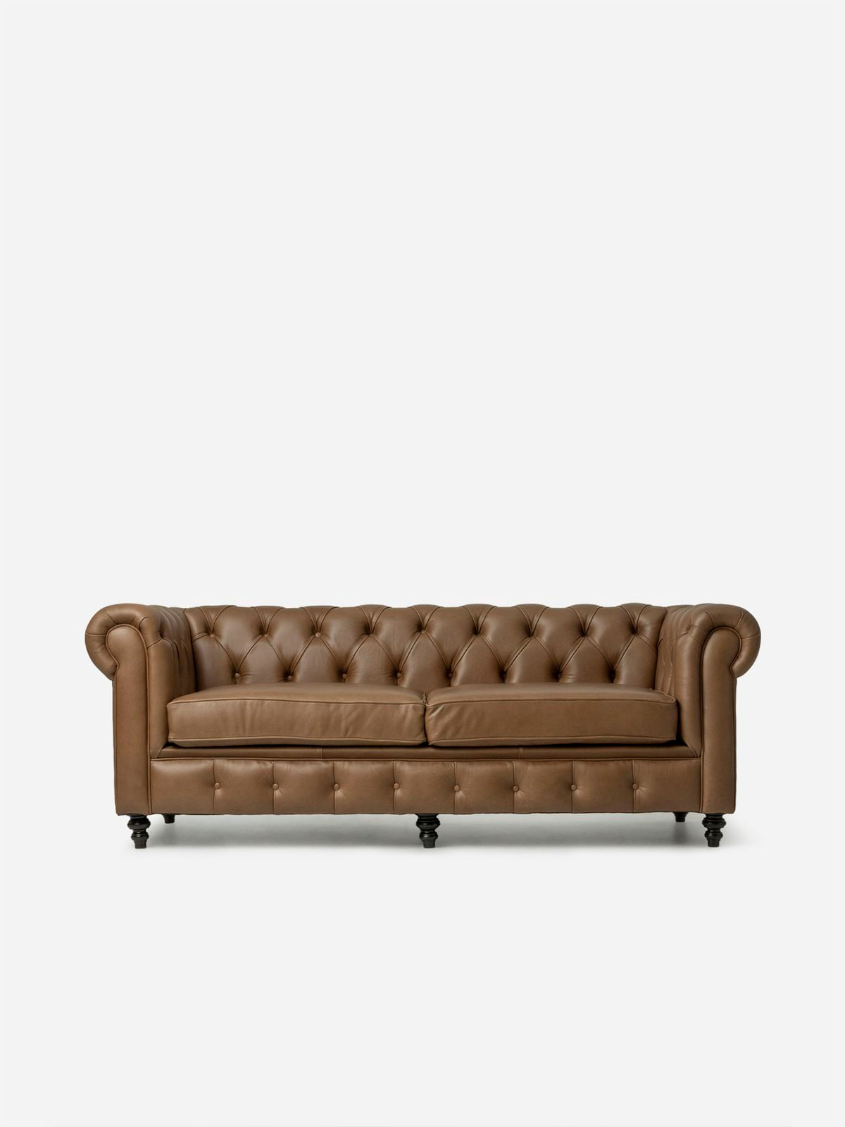 The Madison 3 Seater Leather Couch brings timeless elegance to your home with its Chesterfield-inspired design. Locally crafted with deep button tufting, turned wood legs, and well-balanced proportions, it reflects both tradition and superior craftsmanship. A refined design and generously sized seating make Madison a classic choice that offers long-lasting comfort and enduring style.