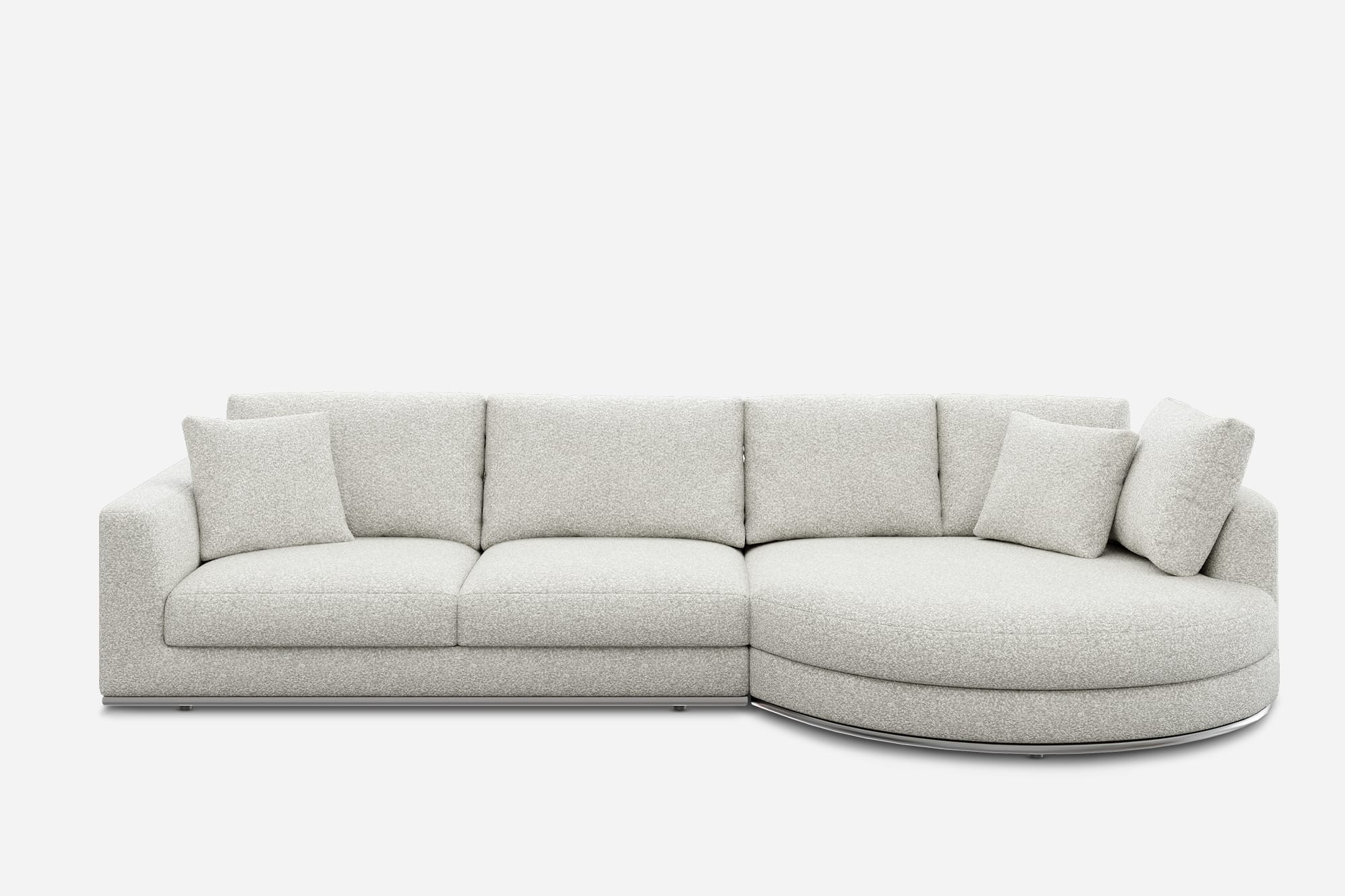 The Nori Rounded Chaise features a sculptural curved design with plush comfort, making it a stylish and inviting lounge piece for modern interiors.