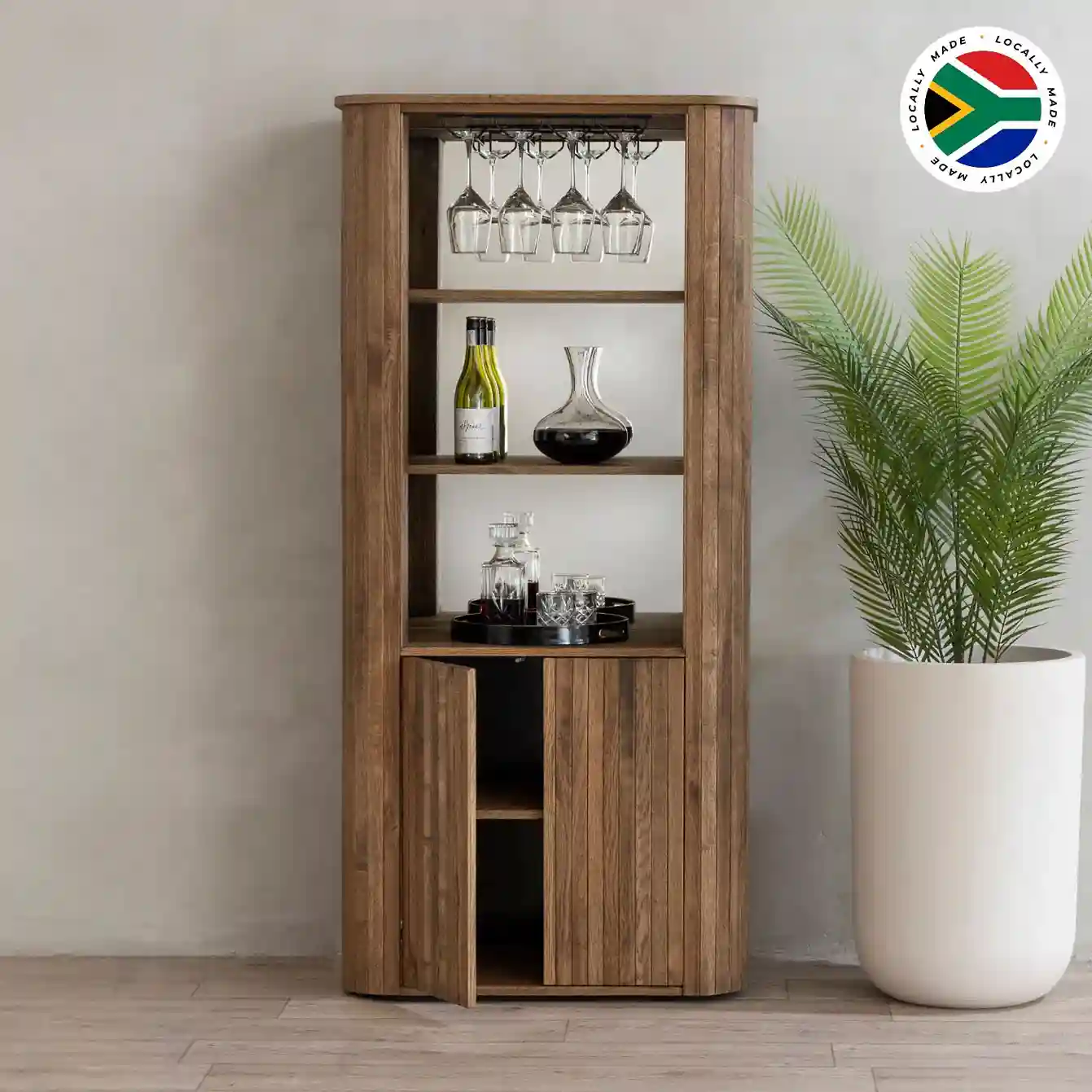 Crafted in South Africa from high-quality Oak MDF veneer with an oil-stained surface, this bar exudes sophistication and warmth.