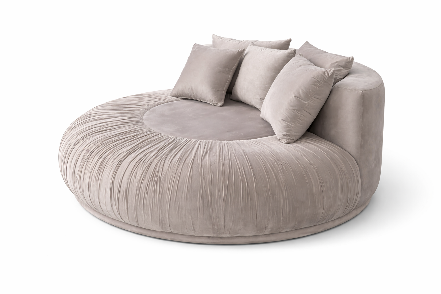The Sandy Pleated Lazy Daybed is a luxury statement lounge piece designed for modern living. With its bold round shape, soft sandy velvet upholstery, and signature pleated detailing, this daybed delivers both comfort and high-end aesthetic appeal.
