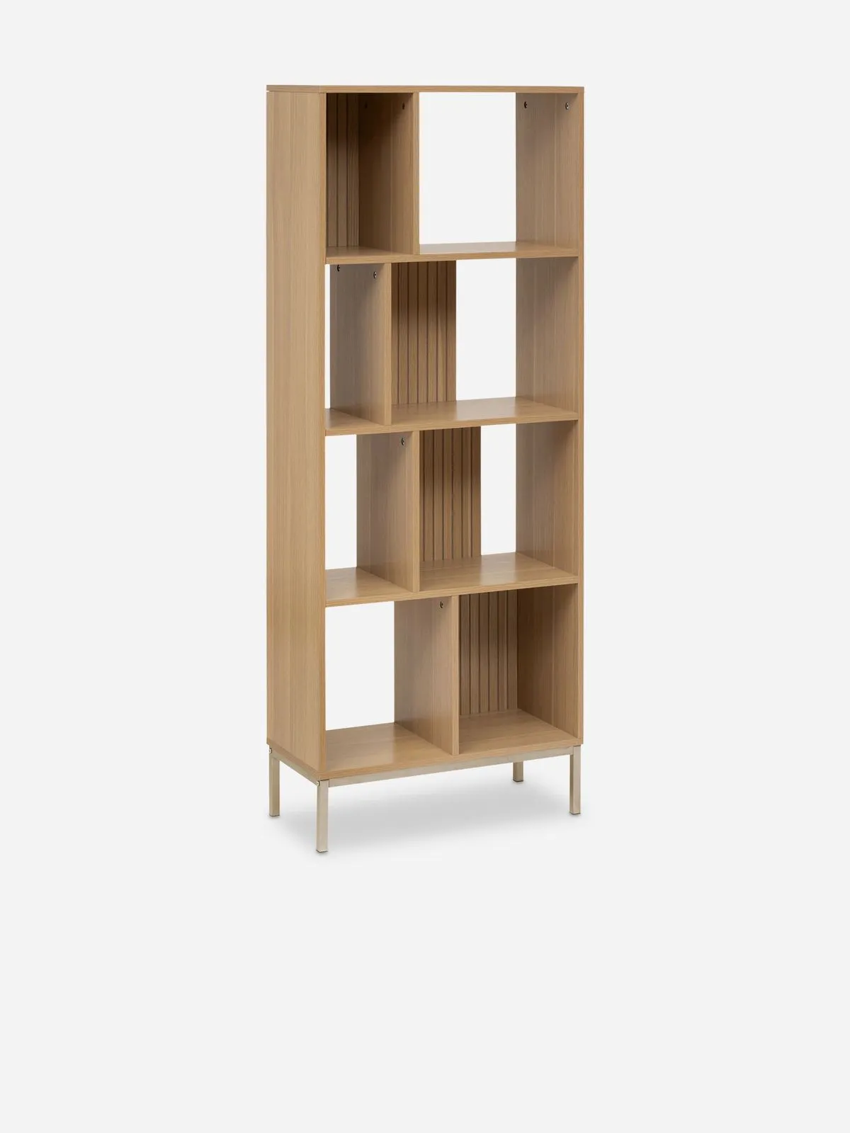 The Self Assembly Five5 Tasso Bookshelf brings a fresh, modern feel to your home with its light wood-look finish, on-trend fluted details, and gold-tone metal base. Tall and narrow with a multi-sectional design, this shelf is ideal for displaying decor, books and interesting objects.