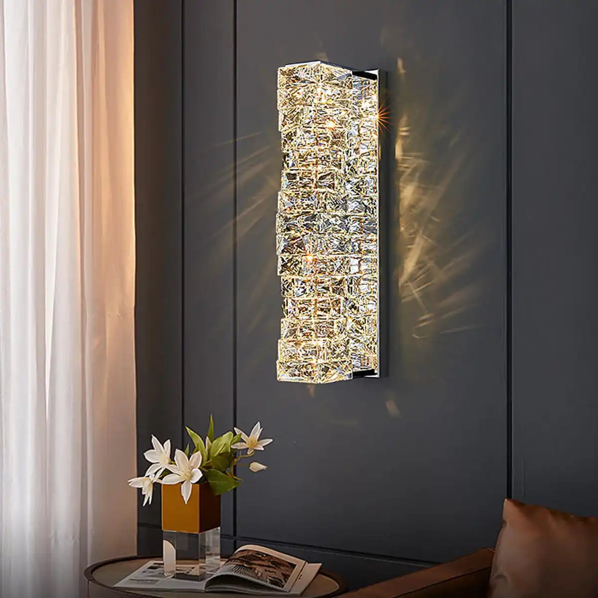 Luxury crystal table lamp with soft ambient glow.